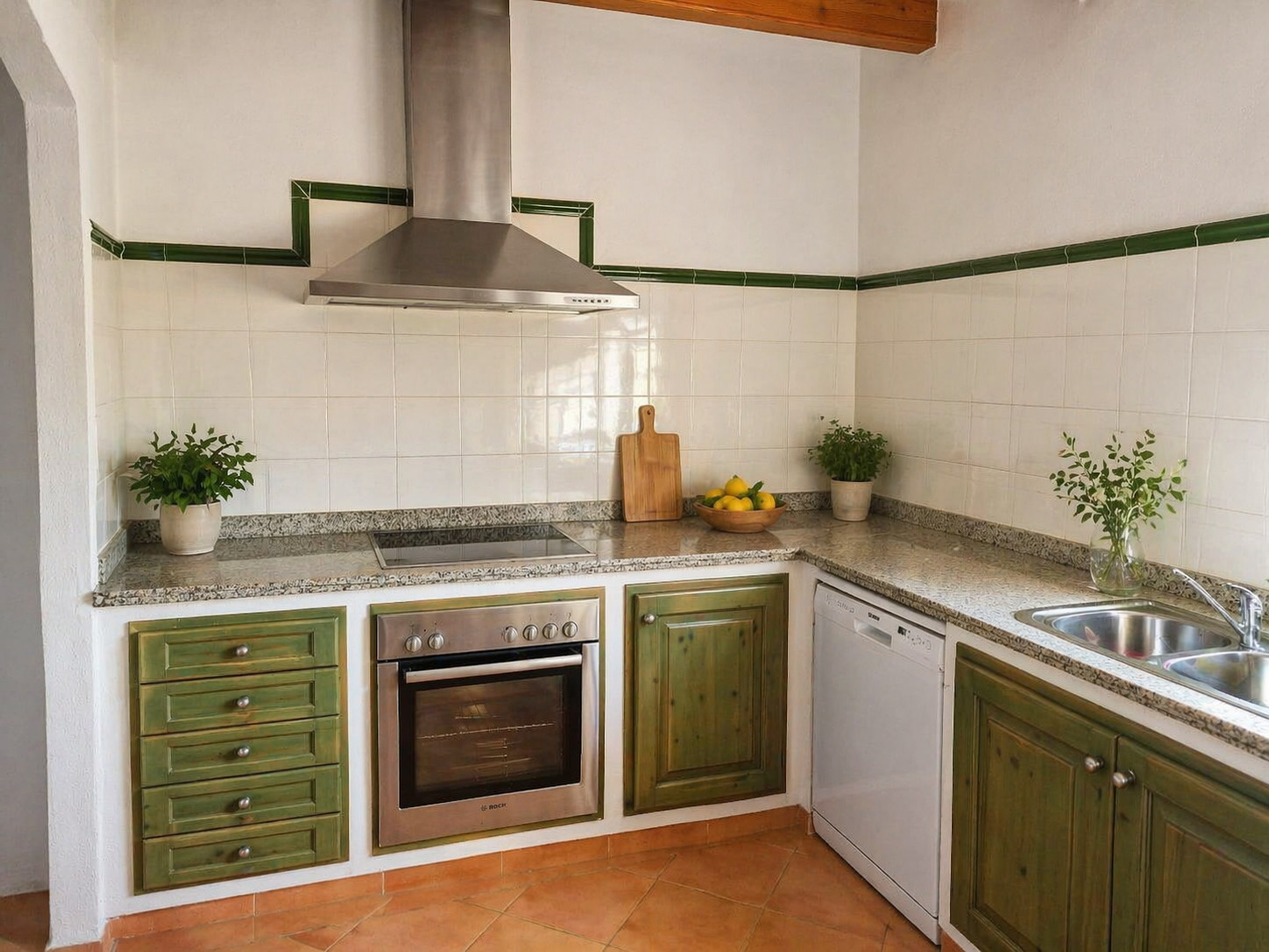 Vollständige Küche mit Ofen, Mikrowelle, Geschirrspüler, Kühlschrank, Gefrierschrank, Kaffeemaschine, Wasserkocher, Toaster, Mixer, Kochfelder, Küchenutensilien und Grill, komplettes Geschirr, Weingläser, Backblech und Kinderbesteck.
